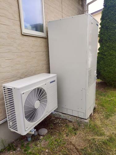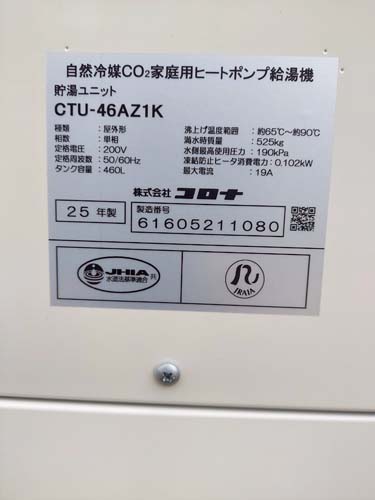 気仙沼市田中 コロナ自然冷媒CO2家庭用ヒートポンプ給湯機 ヒートポンプユニットCHP-DZ601K、貯湯ユニットCTU-46AZ1K エコキュート交換工事