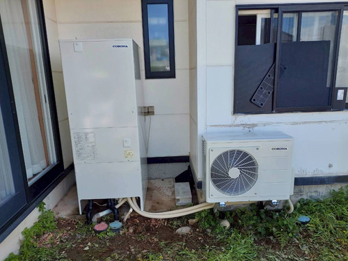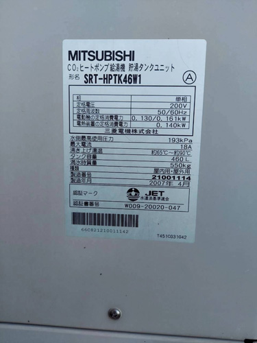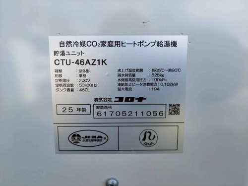 三菱電機CO2ヒートポンプ給湯機貯湯タンクユニットSRT-HPTK46W1→コロナ自然冷媒CO2家庭用ヒートポンプ給湯機ヒートポンプユニットCHP-DZ601K、貯湯ユニットCTU-46AZ1K エコキュート交換工事